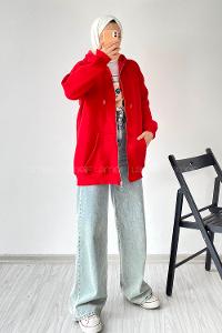 Modalamelif Kapüşon Detaylı Kanguru Cepli Fermuarlı Hırka Kırmızı