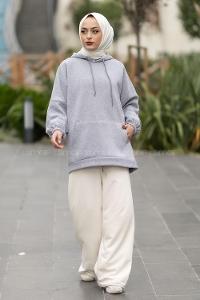 Lamelif Kapşonlu Oversize Yan Cepli Sweat Gri