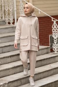 Modalamelif Kapüşon Yaka Torba Kapak Cepli İkili Takım Bej