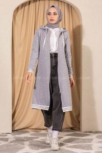 Modalamelif Kapüşonlu Ara Boy Etek Ucu Ribanalı Hırka Gri