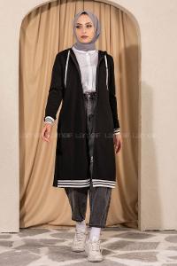 Modalamelif Kapüşonlu Ara Boy Etek Ucu Ribanalı Hırka Siyah