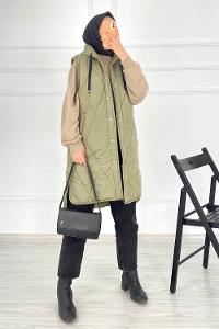 f Kapüşonlu Çift Cepli Çıtçıt Düğme Şişme Mont Yelek Haki
