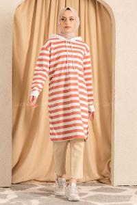 Modalamelif Kapüşonlu Çizgi Şeritli Yırtmaçlı Tunik Beyaz-Pembe