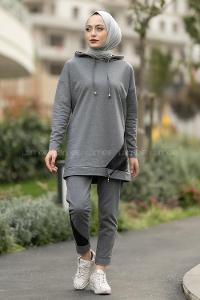Modalamelif Kapüşonlu Etek Ucu Fosfor Detaylı Takım Gri