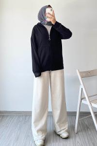 Modalamelif Kapüşonlu Fermuarlı Çift Cepli Hırka Siyah
