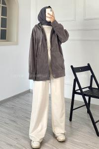 Modalamelif Kapüşonlu Fermuarlı Çift Cepli Polar Hırka Gri