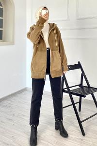 Modalamelif Kapüşonlu Fermuarlı Çift Cepli Polar Hırka Sütlükahve