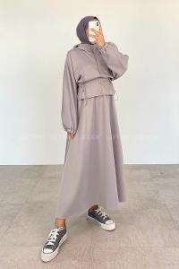 Modalamelif Kapüşonlu Fermuarlı Etekli Scuba Takım Gri