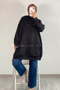 Lamelif Kapşonlu Oversize Yan Cepli Sweat Siyah