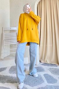 Modalamelif Kapüşonlu Kanguru Cepli Salaş Sweat Hardal