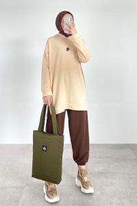 Lamelif Ön Fermuarlı Düz Sweatshirt Bej