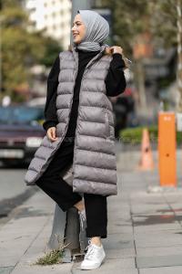 Modalamelif Kapüşonlu Kürklü Çift Cepli Fermuarlı Şişme Mont Yelek Gri