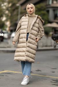 Modalamelif Kapüşonlu Kürklü Çift Cepli Fermuarlı Şişme Mont Yelek Krem