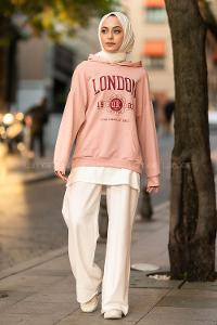 Modalamelif Kapüşonlu London Baskılı Kanguru Cepli Sweat Pudra
