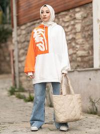 Modalamelif Kapüşonlu Renk Garnili Kanguru Cepli Sweat Turuncu Ekru