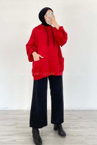 Modalamelif Kapüşonlu Salaş Çift Cepli Sweat Kırmızı