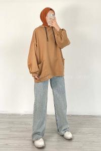 Lamelif Kapşonlu Oversize Yan Cepli Sweat Camel