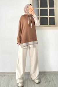 Modalamelif Kapüşonlu Sırt Ekose Etek Ucu Garnili Sweat Kahverengi