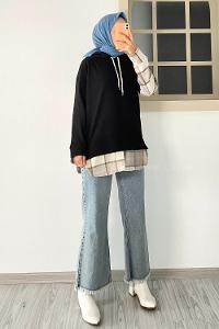 Modalamelif Kapüşonlu Sırt Ekose Etek Ucu Garnili Sweat Siyah