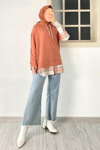Modalamelif Kapüşonlu Sırt Ekose Etek Ucu Garnili Sweat Turuncu