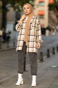Modalamelif Kapüşonlu Tek Cep Detaylı Oduncu Ekose Gömlek Ekru-Taş