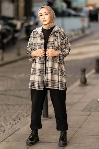 Modalamelif Kapüşonlu Tek Cep Detaylı Oduncu Ekose Pötikare Vizonrengi