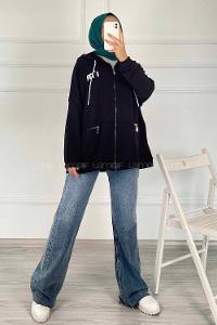 Modalamelif Kapüşonlu Yazı Baskılı Fermuarlı Çift Cepli Hırka Siyah