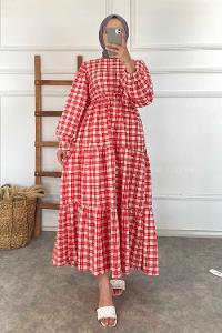 Modalamelif Kare Desenli Beli Lastikli Gofre Elbise Kırmızı