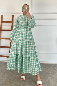 Modalamelif Kare Desenli Beli Lastikli Gofre Elbise Mint