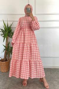 Modalamelif Kare Desenli Beli Lastikli Gofre Elbise Pembe