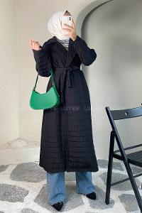Modalamelif Kare Desenli Kuşak Bağlamalı Çift Cepli Kaban Siyah