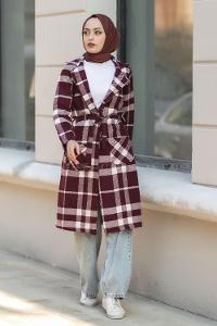 Modalamelif Kare Desenli Kuşaklı Çift Cepli Kaşe Kaban Bordo