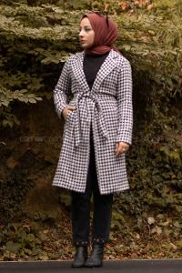 Modalamelif Kazayak Desenli Kuşak Bağlamalı Kaban Siyah