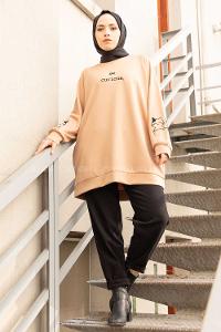 Lamelif Kapşonlu Oversize Yan Cepli Sweat Camel