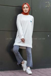 Modalamelif Kelebek Baskılı Yırtmaçlı Uzun Tunik Beyaz