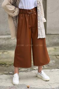 Modalamelif Kemerli Bol Paça Deri Pantolon Taba