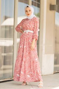 Modalamelif Kemerli Papatya Desen Elbise Pudra