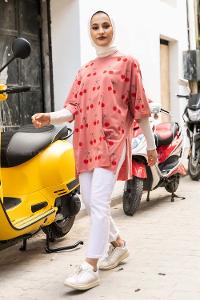 Modalamelif Kiraz Baskılı Yan Yırtmaçlı T-Shirt Gül