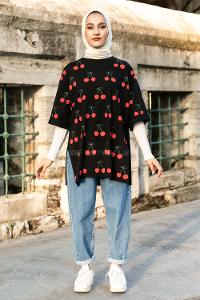 Modalamelif Kiraz Baskılı Yan Yırtmaçlı T-Shırt Siyah