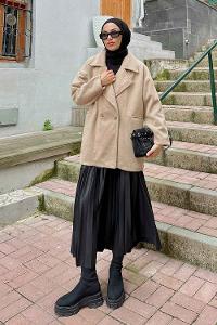 Lamelif Balon Kol Örme Kaşe Kaban Bej