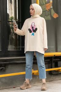 Lamelif Ön Fermuarlı Düz Sweatshirt Bej