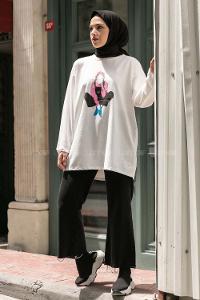Lamelif İki iplikli Arma Detaylı Sweat Tunik Beyaz
