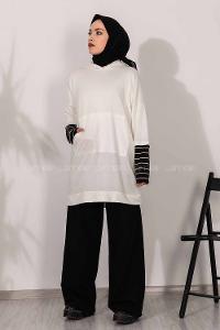 Modalamelif Kol Çizgi Garnili Kapüşon Detaylı Beyaz
