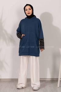 Modalamelif Kol Çizgi Garnili Kapüşon Detaylı Mavi