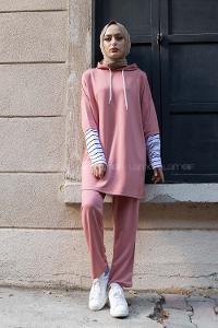Lamelif Bisiklet Yaka Ribanalı İkili Eşofman Tesettür Takım Bordo