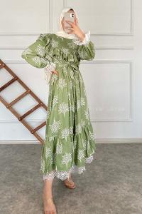 Modalamelif Kol Dantelli Desenli Elbise Çağla
