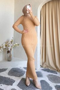 Lamelif Fitilli Kol Ve Etek Ucu Manşetli Triko Tesettür Elbise Sütlü Kahve