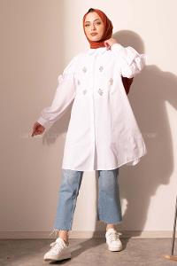 Lamelif Flores Fırfırlı Tunik Beyaz