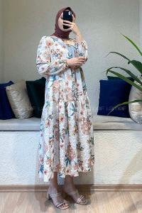 Modalamelif Kol Lasikli Çiçek Desenli Elbise Ekru