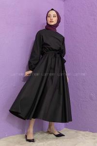 Lamelif Balon Kol Kemerli Tesettür Elbise Siyah